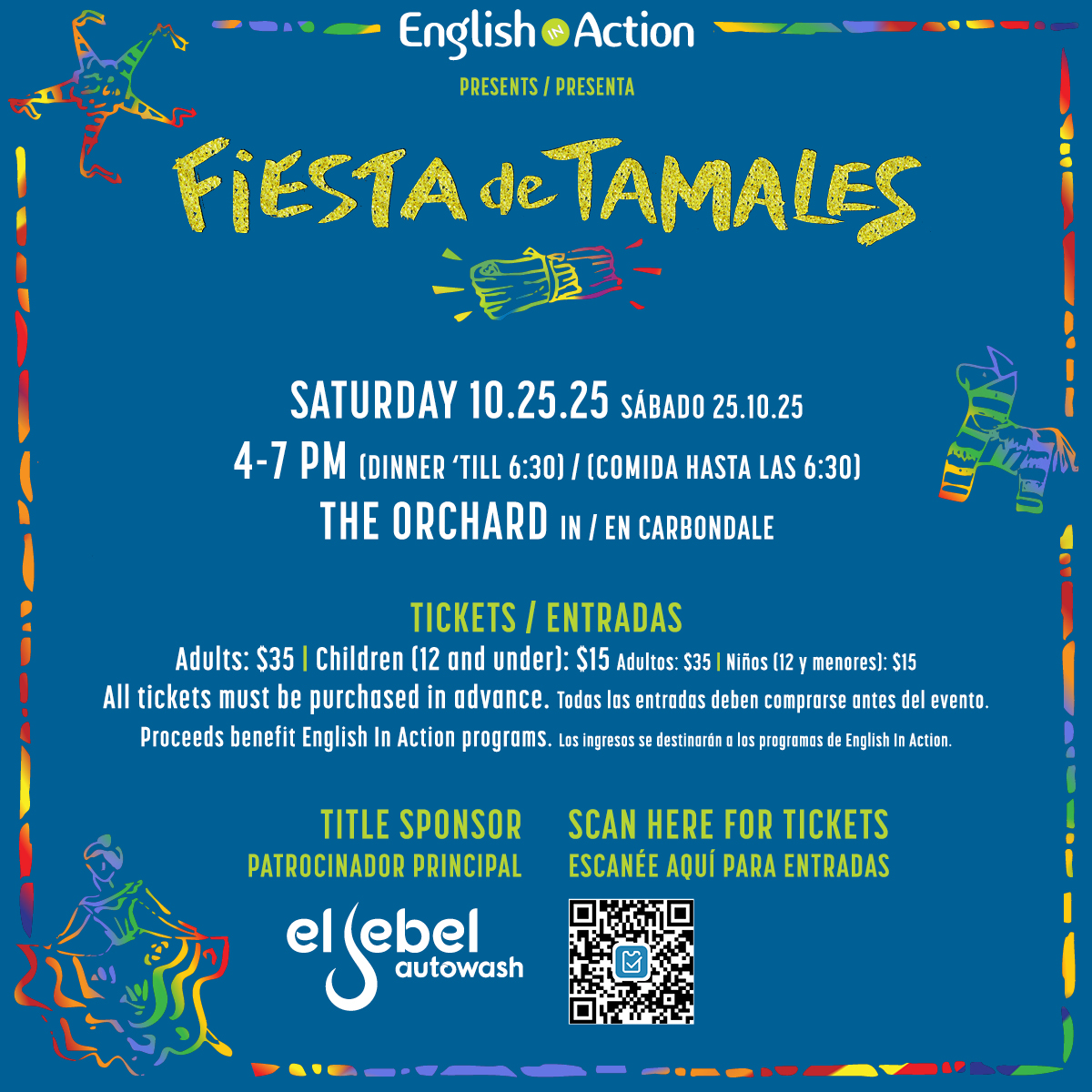 English In Action’s Fiesta de Tamales is a family-friendly event that brings together hundreds of community members from different backgrounds for an authentic multicultural celebration. Planning is well underway for another fun-filled Fiesta this year! The International Food Tasting will return by popular demand, and don’t miss a live performance from Aspen Santa Fe Ballet Folklórico, one of their last scheduled events. All proceeds of Fiesta de Tamales will benefit English In Action’s language development and community engagement programs. Join us Saturday, October 25, 2025 from 4 to 7 pm at The Orchard in Carbondale.
